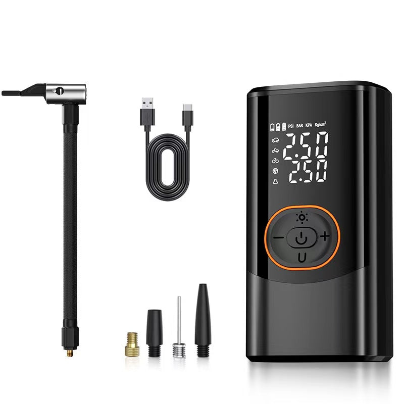 Vær altid forberedt med denne elektriske, håndholdte hjulpumpe, der er nem at bruge og perfekt at have liggende i bilen. Pumpen oplades fleksibelt via USB-C eller USB-A og leveres med 12V cigarettænder-oplader, så du nemt kan lade den direkte i bilen.