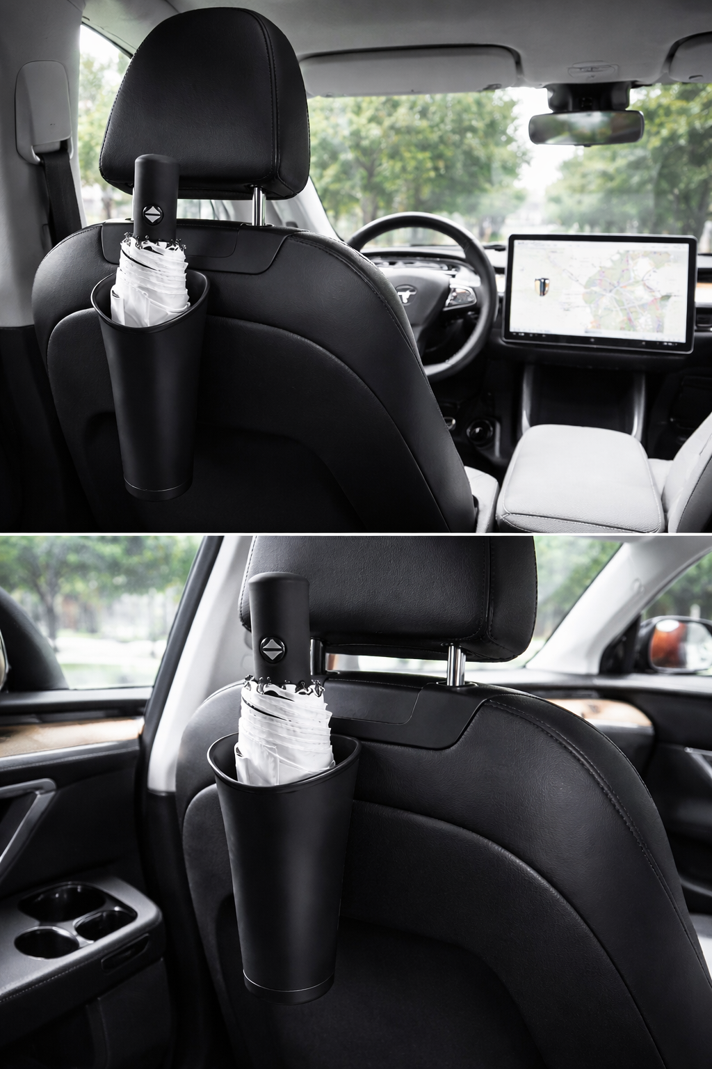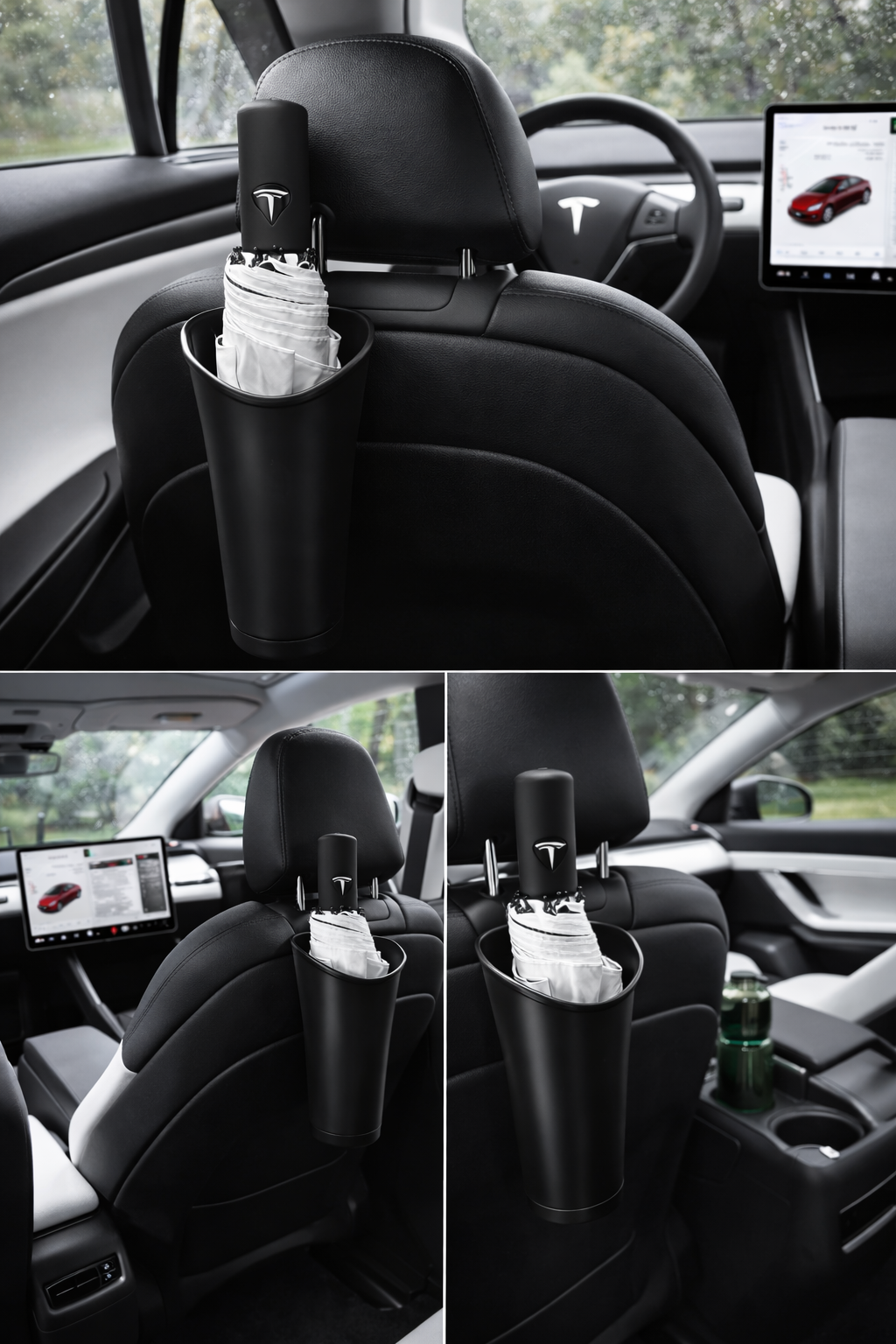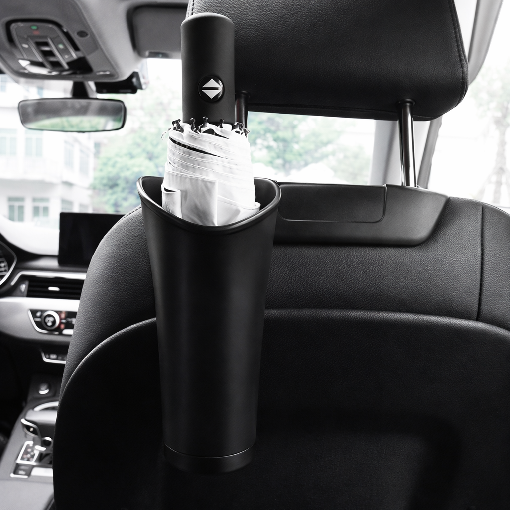 Paraplyholderen monteres nemt på nakkestøtten og giver en fast plads til både sammenklappelige og mindre paraplyer. Den opsamler vand fra våde paraplyer, så sæder og gulv forbliver tørre og pæne.