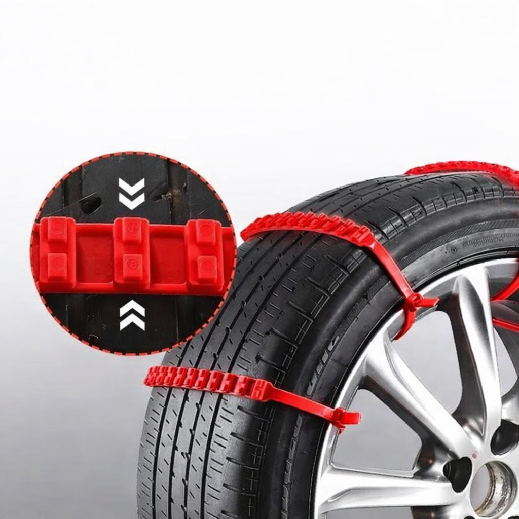 Sættet består af 20 kraftige plastikstrips med store gribeknopper, som nemt monteres direkte rundt om de trækkende hjul. De giver ekstra greb, så hjulene får fat og bilen kan komme videre.
